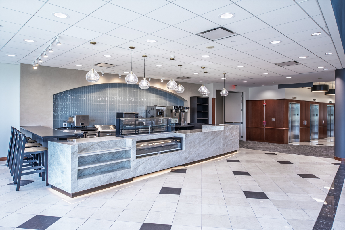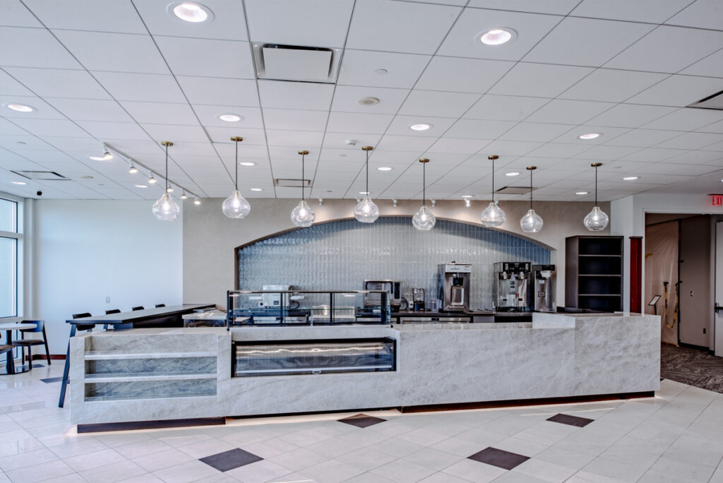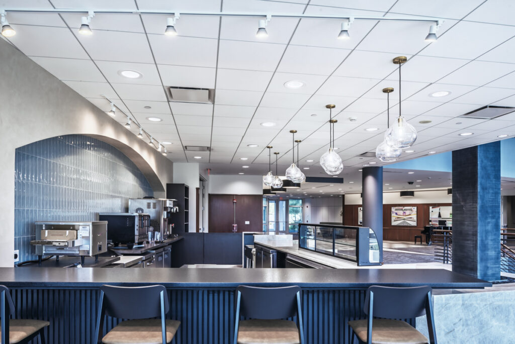 The new Atlas Café features a contemporary design centered around a quartzite wrapped service counter with integrated shelving and display space.