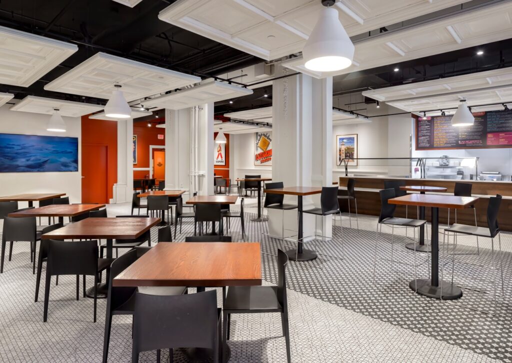 Warm orange accent walls, bold vintage-style posters, and crisp white ceiling panels add personality and vibrancy, while strategic lighting highlights the menu and seating areas. The result? A space that feels inviting, efficient, and full of character—perfect for the fast-paced lunch crowd South Union Cafe is known for.